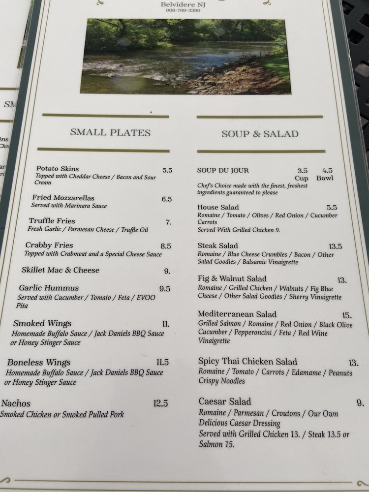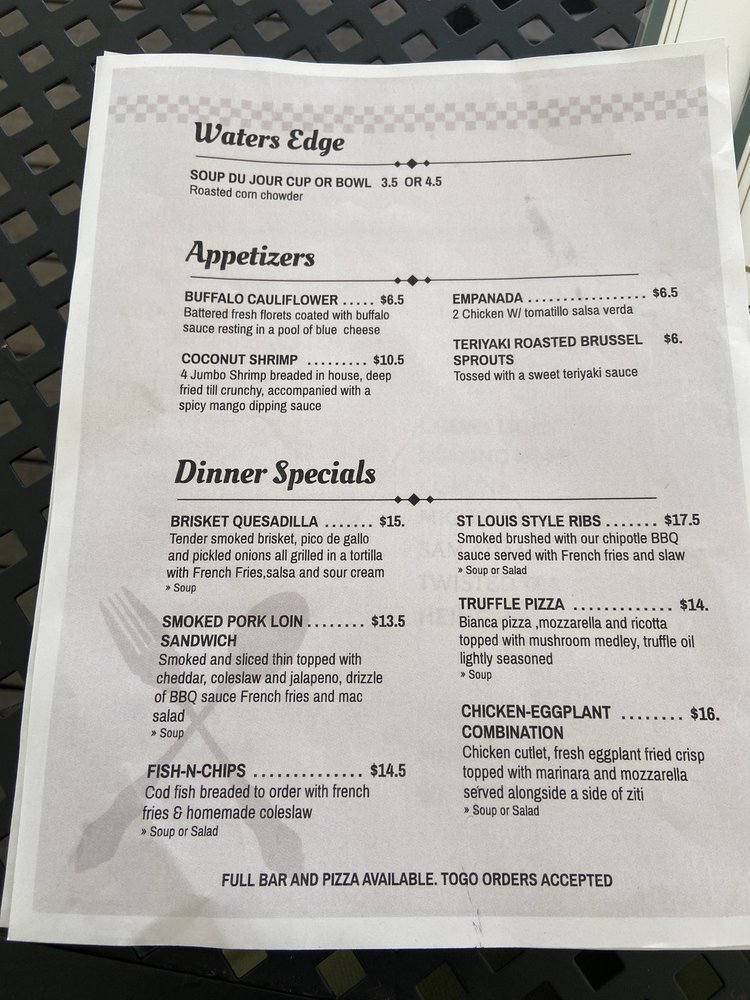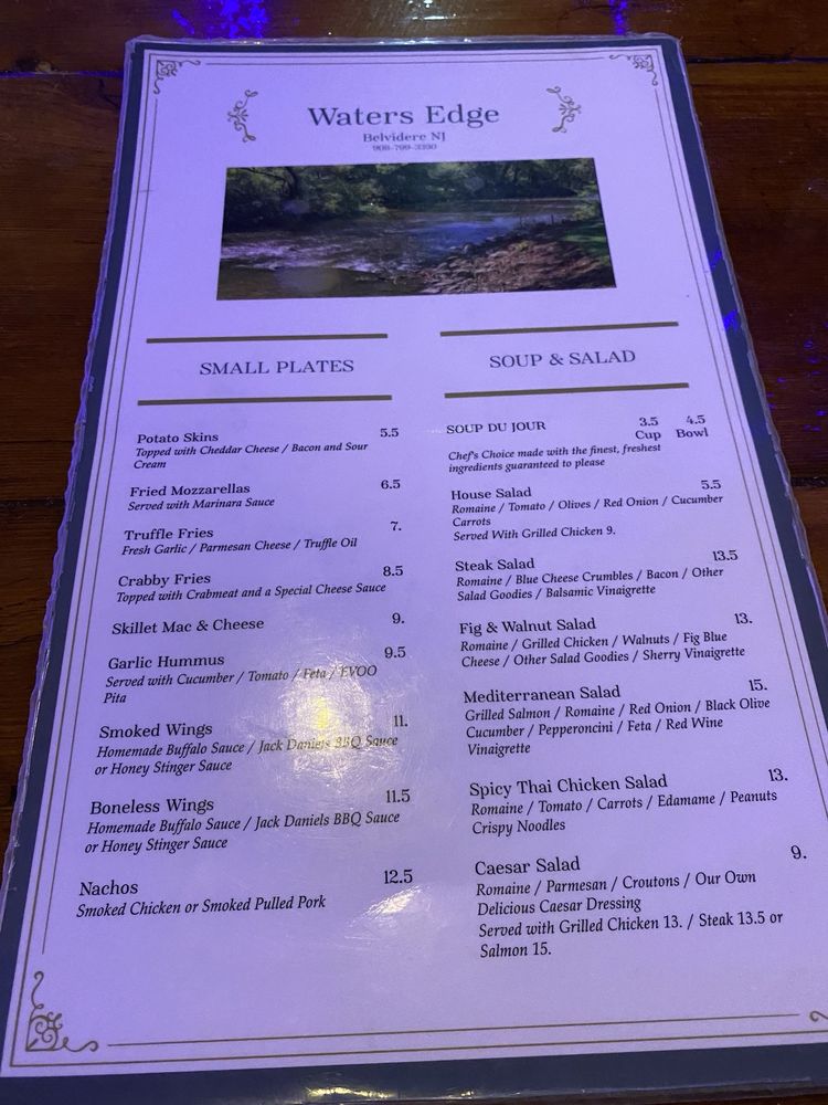 Located in Belvidere, NJ, Waters Edge offers a diverse menu featuring pizza, burgers, and a variety of options for vegetarians. With a casual and warm atmosphere, customers rave about the friendly service and delicious food. The outdoor seating by the river provides a picturesque setting for enjoying your meal. Specialties like smoked wings, catfish, and bacon-wrapped meatloaf receive high praise from patrons. The menu also includes unique specials, such as teriyaki Brussels sprouts and pork chops stuffed with cornbread stuffing. Refreshing beverages like dirty martinis and Buffalo Trace whiskey are available at the bar. Waters Edge stands out for its quality dishes, reasonable prices, and attentive staff, making it a must-visit spot for a laid-back dining experience.